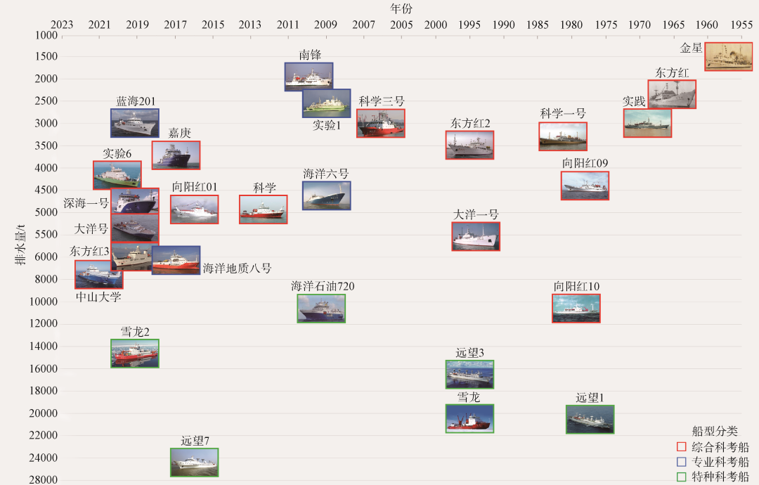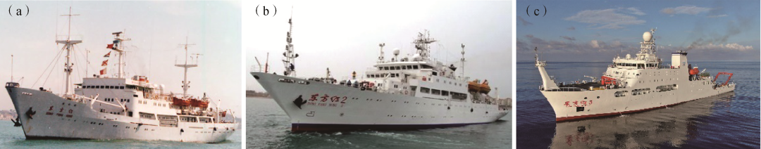 中国海洋科考船的发展分为3个时期。第1段发展期是20世纪60—80年代,科考船不再经由旧船改造,开始出现专门设计建造的科考船。这个时期中国建造了第1艘2500 t级海洋实习调查船“东方红”号、3000 t级综合调查船“实践”号以及分散到各海洋调查研究机构的首艘“向阳红”“远望”“实验”“科学”“探索”“曙光”“奋斗”“中国海监”系列的科考船。这些科考船开始使用先进的海洋调查设备,在性能、布置以及实验室与专用设备的匹配等方面,与旧船改装的调查船相比有“质”的提高,可以称之为“第一代海洋调查船”。这一代科考船承担了中国渤海、黄海、东海和南海等近海海洋调查与专项研究,奠定了中国海洋科学技术事业的基础,其典型代表是1988年获得国家科学技术进步奖特等奖的“向阳红10”号远洋综合调查船。第2段发展期是20世纪90年代至2010年前后。这个时期国内科考船发展相对迟缓,除自主研制的“东方红2”号、“远望3”号和“远望4”号外,仅有从国外购买并改装的“大洋一号”和“雪龙”号。由于这个时期的新船数量有限,远未满足中国海洋科学快速发展的实际需求,也成为21世纪后中国第1代科考船船龄超长和性能欠缺后需求井喷的原因之一,但无论怎样,这个时期的科考船为“查清中国海、进军三大洋、登上南极洲”奠定了装备基础,成为第2代主力科考船。第3段发展期是从2010年左右开始,也是中国科考船“质”和“量”的高速发展期。这时期以国家重大科技基础设施建设项目“科学”号成功研制为第3代科考船的里程碑,船舶电力推进系统和动力定位系统被逐步推广。科考作业和实验室采用模块化设计、水下辐射噪声和舱室环境控制受到进一步重视,各种专业科考设备如温盐深(Conductivity Temperature Depth, CTD)探测系统、全海深多波束探测系统、气象雷达等与船舶平台形成一体化设计等。据统计,2010—2021年中国新建海洋科考船的数量达到32艘,涌现出一大批世界先进水平的科考船,25000 t级的“远望7”号圆满完成“天宫二号”“嫦娥四号”、北斗卫星等21次海上测控任务;国内首艘、世界第4艘获得水下辐射噪声最高等级SILENT-R证书的海洋综合科考船“东方红3”号挺进国际主流科考船行列;全世界第1艘六缆高精度、短道距地震电缆三维物探船“海洋地质八号”使中国站上国际海洋物探领域船型技术的制高点;全球首艘具备艏艉双向破冰技术的极地科考破冰船“雪龙2”号成功首航南北两极,填补了中国极地科考重大装备领域的空白;国内排水量最大、综合科考性能最强的海洋综合科考实习船“中山大学”号实现了直流母排+储能蓄电池、轮缘永磁侧推、全航速主动式减摇鳍等多项新技术的集成创新。70多年来,中国海洋科考船从上百吨拓展到数千吨、几万吨,调查能力从中国沿岸浅海延伸到深海大洋、南北两极,调查内容也从单一学科调查转化为多学科多功能多技术手段的综合科学考察。海洋科考船作为最主要的海洋科考装备在支撑国家海洋强国建设中作出了卓越贡献。