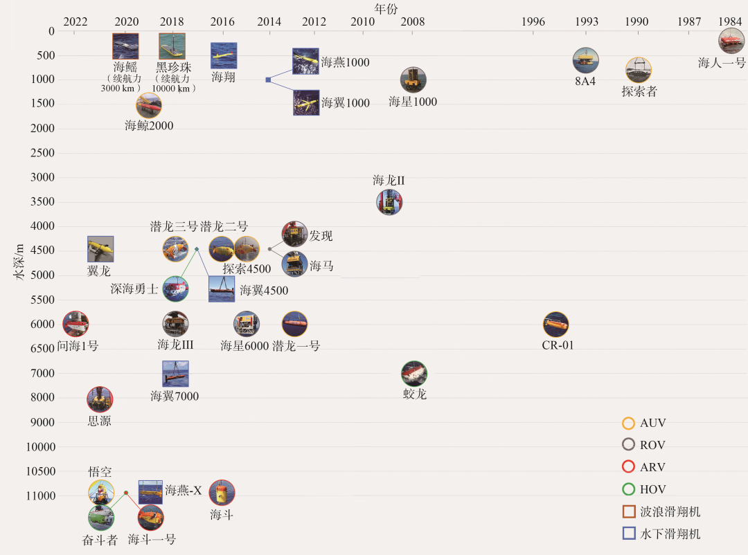中国海洋运载器发展历程大致分2个阶段。2010年之前,中国处于各类水下和水面运载器的首创和起步阶段,以20世纪80年代和90年代的7103救生艇(HOV)、200 m水深的“海人一号”ROV、800 m水深的“探索者”号AUV等为代表的首台套装备拉开了中国海洋运载器的创新历程,2010年首台下潜深度突破7000 m的HOV“蛟龙”号,成为这一时期中国海洋运载器自主创新的典型标志,荣获国家科学技术进步奖一等奖。2010—2020年,中国进入了海洋运载器自主创新的快速发展期,装备成熟型号从过去几十年10余型猛增到10年间的约30型以上。HOV领域分别诞生了4500 m水深“深海勇士”号、11000 m水深的“奋斗者”号潜水器等深海利器,实现了耐压结构设计及安全性评估、钛合金材料制备及焊接、浮力材料研制与加工、深海锂电池研制、声学通信定位、智能控制技术等方面的多项重大技术突破,中国一举成为全球少数几个具备深海HOV建设、科考应用和保障能力的国家之一。ROV领域,中国已形成自主可控的深海作业级ROV技术体系,具备自主设计、制造、应用与维护能力,先后研制成功“海马-500”“海马-2000”、“海象-2000”“海马-4500”“新海马”“海星-6000液压”“海龙Ⅱ”“海龙Ⅲ”等液压作业级ROV,以及“海星-1000”“海星-6000电动”和“海马-E6000”等电动作业级ROV,形成了作业水深覆盖500~6000 m的ROV系列产品,实现了国产高新探查技术装备在海洋地质调查应用领域的突破。AUV领域,中国自主研制涵盖便携型、轻型、中型、重型等在内的全海深系列化装备,形成了4500~6000 m水深“潜龙”系列、100~4500 m水深“探索”系列、1000~2000 m水深“海鲸”系列、11000 m水深“悟空”号等重大装备,主要性能指标与国际同类水准基本相齐。ARV领域,中国近5年来抢抓混合式机器人发展浪潮,重点研制了11000 m水深“海斗”系列和6000 m“问海1号”等装备产品,成为继日本和美国之后第3个拥有万米级自主遥控机器人研制能力的国家。水面和水下滑翔机领域,中国快速追赶,研制了“海燕”系列、“海翼”系列、“黑珍珠”号等典型装备。2017年“海燕”水下滑翔机下潜超过6000 m,连续工作91 d,航行1884 km,刷新了水下滑翔机下潜深度、续航力和观测剖面数量的新纪录,同时在北极科考中得到首次应用。2021年“黑珍珠”波浪滑翔器解决了在极端海况下生存作业和实时通信的关键难题,从“向阳红01”科考船释放后自主航行48 d累计1349 km,首次完成跨赤道海气要素的观测。此外,珠海云洲智能科技股份有限公司“极行者”小型无人艇2017年远赴南极为中国罗斯海新站建设提供必要的海底地形数据。以上这些关键装备的成功研制为中国海底资源、地质和深海生物调查等科学研究提供了坚实的技术支撑。