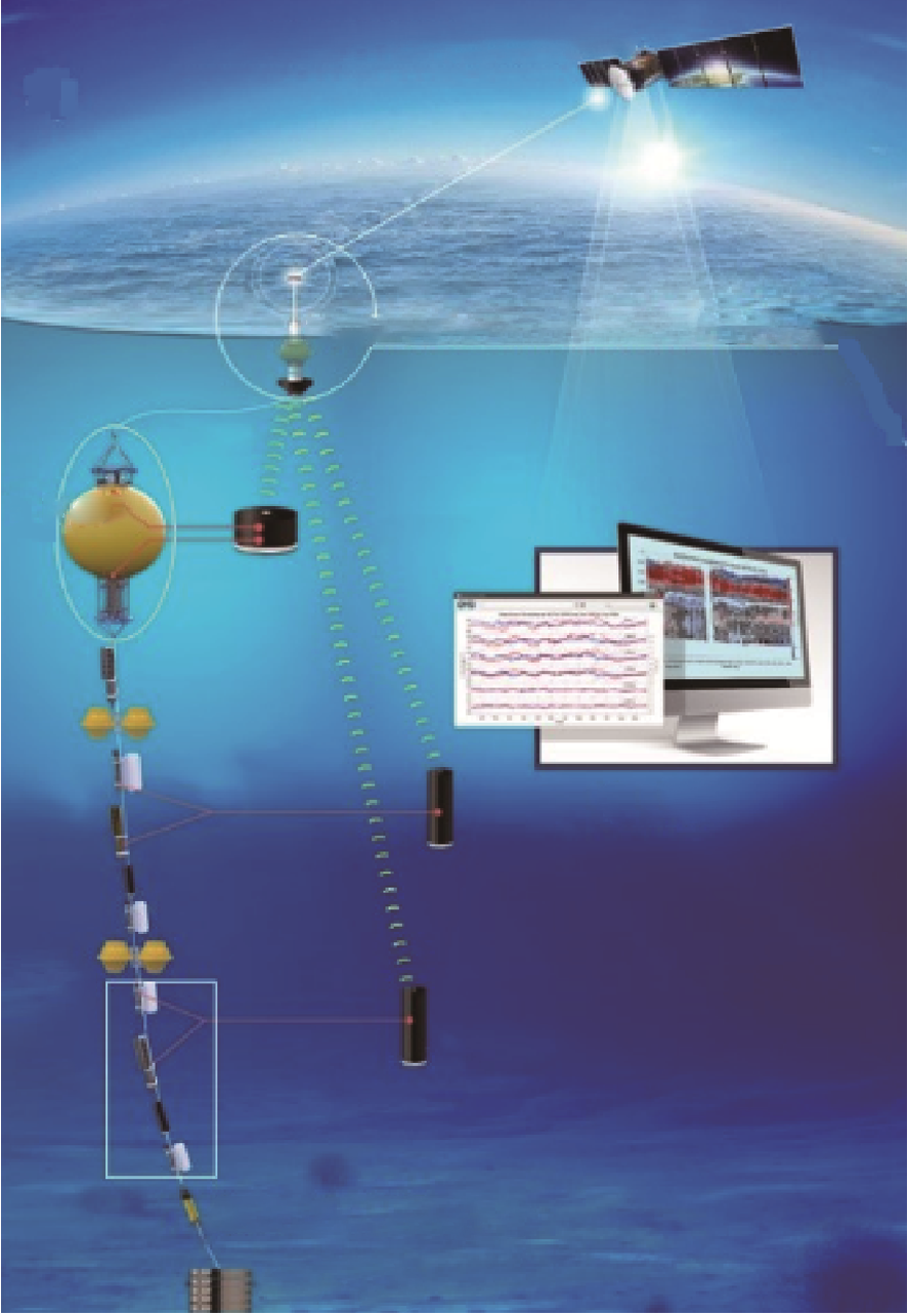 国际海洋浮标的发展始于20世纪20年代,潜标技术研究始于60年代,目前全球海洋科技强国实现了长期业务化运行,在可靠性、精度、稳定性等方面技术成熟。中国海洋潜浮标研制起步晚,但在一些领域实现了突破。20世纪60年代研制出第1个浮标,80年代在南海成功布放第1代自容潜标。2008年,中国研制了连续工作2年的第四代大型锚系浮标FZF4-1型,直径达到10 m,成为中国海洋资料浮标网主力浮标。2012年自主研制的“白龙”7000米级浮标正式布放进入全球海洋观测系统(图3),使中国成为继美国、日本之后第3个具备深海气候浮标观测的国家。2016年,中国 科学院在西太平洋攻克了潜标数据长周期稳定实时传输的海洋观测难题,目前实时传输观测数据的深度由1000 m逐步拓展至6000 m。2017年,中国以自主研发的海洋环境实时监测潜标等40余套深海潜标(图4)为主体构建了“南海潜标观测网”的基础,实现对南海深海盆的全覆盖观测。经过长期摸索与研发,中国潜浮标在近海建设了业务化观测系统,远海构建了南海立体观测网和西太平洋科学观测网等区域网络,为中国海洋环境和气候预报、海洋动力环境系统长期连续观测提供了宝贵数据。