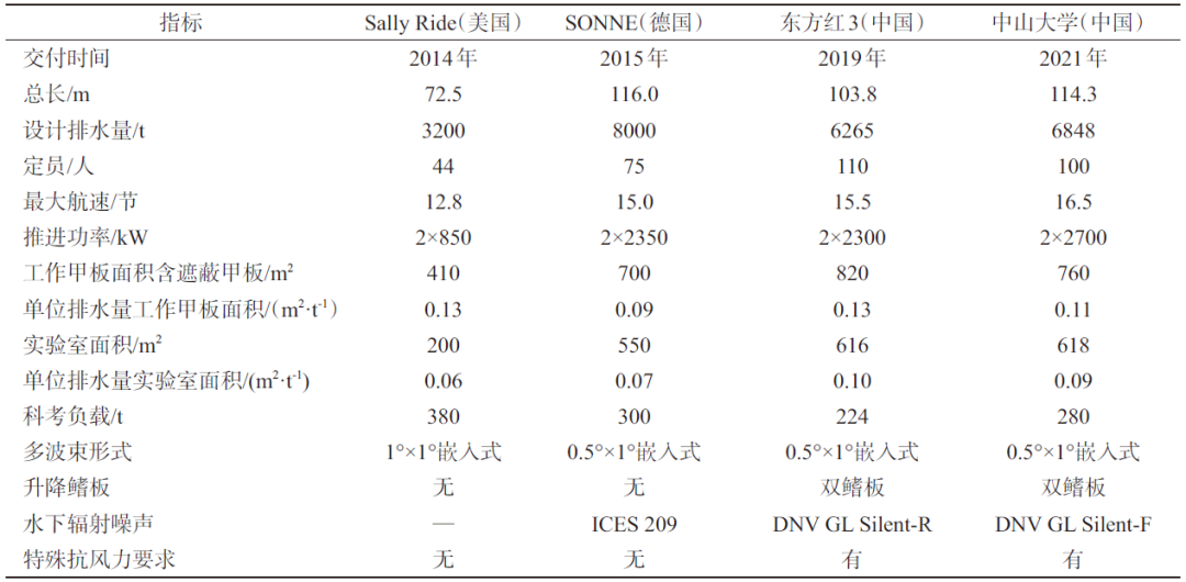 在全球化进程中,中国科学家参与了众多国际考察计划,在国外很多科考船上生活工作过,深刻体会到国内上一代科考船已无法适应迅猛发展的海洋科考需求。“海洋强国、装备需先强”,中国科考船从“科学”号研制再到“东方红3”号、“中山大学”号(图8)成功交付,国内海洋科学家和船舶设计建造者们用了整整10年的时间,基本追平了世界海洋科考船的先进水平,部分性能甚至优于国外。中国海洋科考船历经艰辛,终于从世界舞台的边沿走到了中央,逐步投身到建设海洋强国的战略征程中。表1为国内外最新科考船主要船型指标对比。