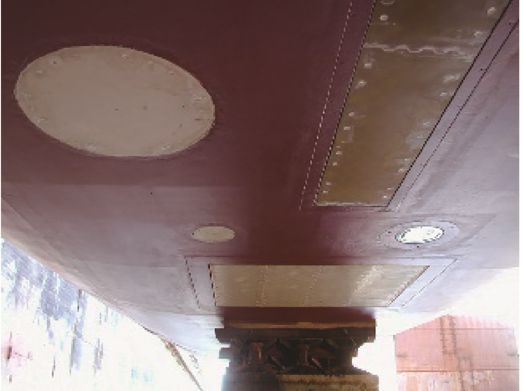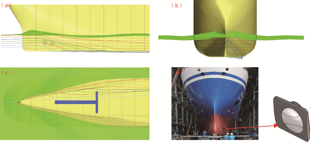 现代海洋科考船在船型设计理念上已经从分别独立考虑船舶平台与作业系统的各自性能优化转变到围绕境(环境)、静(安静)、净(洁净)3个“Jing”的“一体化设计新理念”。面向“环境”设计主要考虑水下流场环境无气泡干扰,适于声学设备工作;甲板上的生活、作业环境良好,布局合理;实验室环境下的人员流、数据流和样品流程序便捷,科学规范;驾驶、作业和观察环境下的视线良好,不受阻挡;空间电磁环境、电站和通信条件充裕,可扩展性强。面向“安静”设计主要考虑船体内的振动噪声和水下辐射噪声指标满足舱室舒适度和水下探测设备定位与测量要求。面向“洁净”设计主要考虑确保与实验相关的水、电、气品质控制以及样品的洁净度。在技术创新的过程中,国内已逐步攻关4个一体化设计关键技术并产生了多项重要的技术发明专利:①船体型线与多波束防气泡干扰一体化技术;②船型方案与振动噪声控制一体化技术;③综合布置与科考多目标优化一体化技术;④电气设计与电磁兼容一体化技术。以第1个关键技术为例,海洋科考船靠近船首1/3船长范围的船体底部通常需固定安装较多灵敏的声学探测设备(如深水多波束、浅水多波束、单波束、浅地层剖面仪、ADCP等),但该范围在航行中却又是极易受船首兴波、压浪以及侧推孔气泡和噪声影响的区域,船型首部声学环境的优化成为重点。中国设计团队着力研究船底声学设备被干扰的现象和机理,完全掌握气泡下泄模拟观测手段和流线评估控制方法,一举舍弃以前较多采用的深水多波束悬挂于船体底部的小尖船(Gondola)形式或从船体底部向下气泡突出安装的导流罩形式,而是基于嵌入安装的线型优化方法,提出一种防气泡隐形球首一体化设计的科考船型(图10)。同时为彻底避免船艏隧道式侧推孔带来的涡流下泻和噪声干扰,还创新设计了与船体曲面一致的侧推封盖系统,最终在确保声学探测设备性能精度的前提下大大改善了航行安全性和经济性。