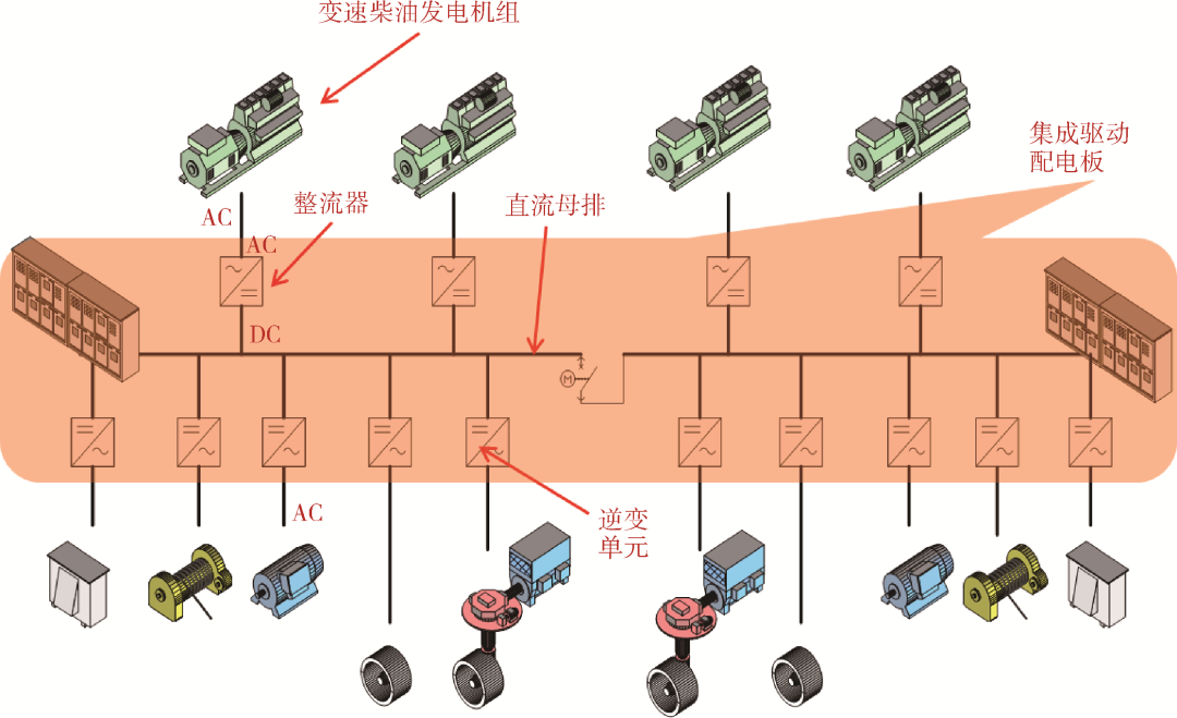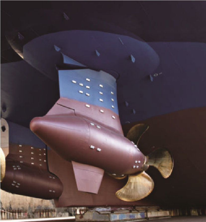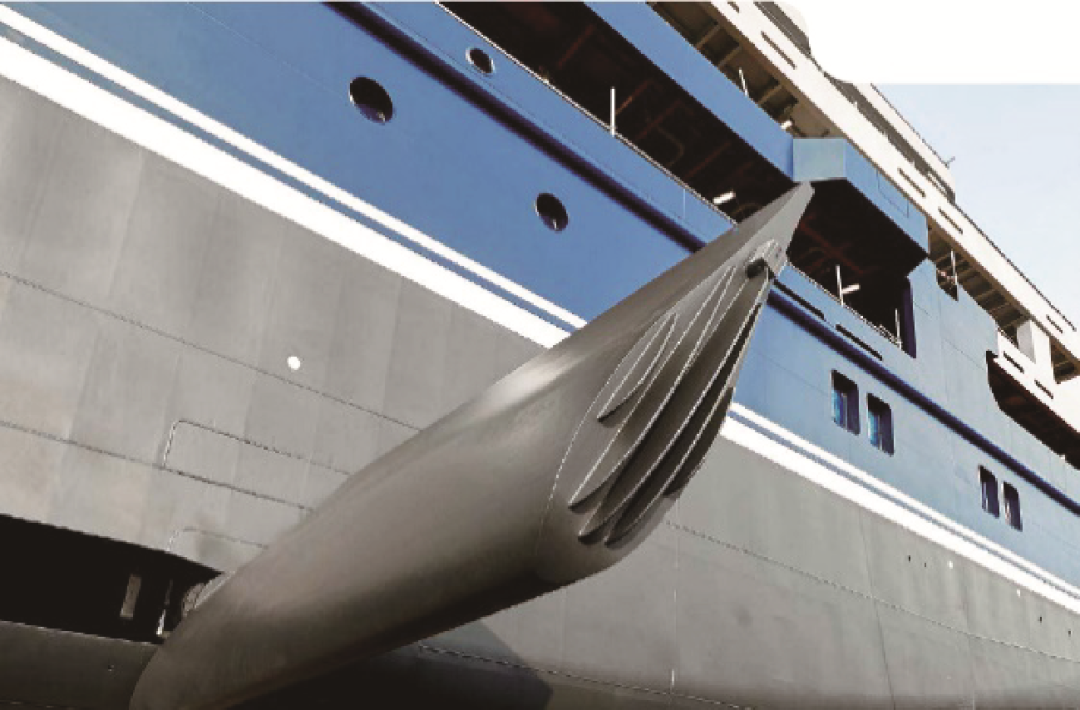 海洋科考船始终是新技术新装备创新与应用的排头兵,每一代海洋科考船的技术进步与船舶新技术有着密切联系。20世纪末船舶综合电力推进技术引发了船舶动力的第3次革命,现代海洋科考船因其对多工况负载平衡、振动噪声、智能控制等的高品质作业需求,几乎率先采用了电力推进的诸多新技术。按电网电制,有低压690 V电网也有6600 V电网;按变频器变频技术,有二极管前端(Diode Front End, DFE)变频技术、有源前端(Active Front End, AFE)变频技术和公共直流母排技术(图12);按推进电机技术,有永磁电机也有励磁电机,有同步电机也有异步电机。正因为采用了电力推进,一些依托其上的船舶矢量推进技术(吊舱(图13)、Z型机械推进、直叶桨)、动力定位技术、蓄电池储能技术、岸电技术、智能驾驶技术均得到快速推广。在这一代电力推进科考船集成创新、实船应用的过程中掌握了诸多电气设计,如允通能量分析技术、电能质量智能诊断技术、区域环境电磁背景噪声监测技术等关键技术,同时也实质性推动了中国船舶设备的国产化进程。近几年,船舶减摇技术得到快速发展,从被动可控式减摇水舱、伸缩式减摇鳍到零速下主动减摇的全航速减摇鳍(图14),无论是鳍板翼型还是控制系统,均得到了实船充分验证,为关注零速和低速下作业能力的新型科考船大大提高了作业效率并降低了晕船率。当前,船舶装备在绿色、智能的快车道上发展,作为创新排头兵的海洋科考船,已经在“身体力行”。目前国外已看到某新型科考船(德国“Atair Ⅲ”号已交付)采用液化天然气(LNG)为燃料之一的双燃料柴油机来满足部分时段的洁净科考需求,国内也出现了在新型科考船上尝试自主航行和远程遥控的智能船舶新技术(中国“珠海云”号已下水)。这些开创性的工作确保了船舶平台的总体先进性。