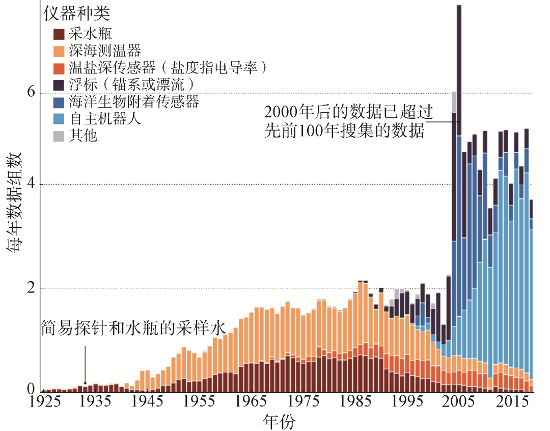 要了解中国下一代海洋科考装备的发展方向,在论证需求的基础上对照查找各自装备的不足。总体上看,现有海洋科考船面临的不足主要有:①极端环境(极端天气、极端海况、极地、战场环境等)适应性不足;②科考作业效率不足。现有海洋运载器面临的不足主要有:①续航能力不足;②跨介质通信能力不足;③导航定位精准度不足,尤其在极区;④结构材料承压和耐腐蚀性不足。现有海洋潜浮标系统面临的不足主要有:①设备性能不足;②数据应用不足。这些装备的共性问题是相互组网协调和信息共享不畅、海上运行不稳定、传感器相对落后、搭载能力偏弱、软件平台不被重视。解决这些问题需要充分融合绿色/智能/无人/大数据/通信/网络/核能/遥控等各种新技术,尤其要从体系解决的角度出发,真正实现跨域融合。未来的海洋科考,无论采用何种海洋科考装备,获得的主要成果还是数据。根据世界海洋数据库统计显示,21世纪以来至今不到20年时间,科考采集的数据已超过先前100年采集的数据之和,在2005年后由于自主机器人的广泛应用采集数据量更是一路飙升(图22)。
