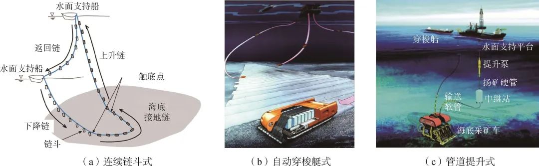 海底采矿车是海底矿石开采的核心技术装备之一。多金属结核一般赋存于平坦海底,与海底沉积物共存,可采用机械式、水力式或水力—机械混合等方法采集;富钴结壳生长在基岩表面,一般采用螺旋滚筒将矿石从基岩剥离并破碎和收集;多金属硫化物的采集方式与富钴结壳较为接近,一般首先处理复杂崎岖的地形,开拓采矿台阶,而后完成矿石采集。