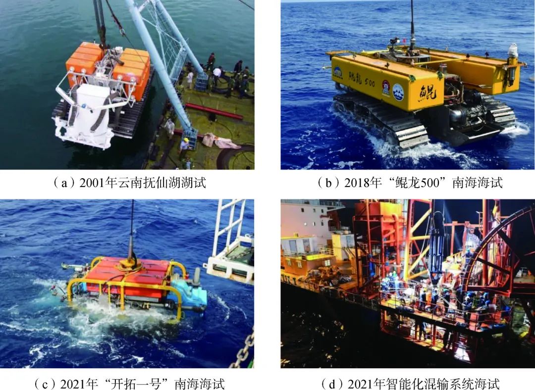 2005年,中国完成1000 m海试总体设计和各子系统的详细设计,研制了两级高比转速深潜模型泵。2016年,中国首次开展深海采矿单体海试,针对开展深海扬矿泵管输送系统,完成了复杂海况下泵—管系统的布放回收以及多级离心泵粗颗粒矿浆输送,管道布放水深304 m,管道总长638 m,矿浆体积流量500 m3/h,验证了中国深海采矿输送工艺、参数和关键设备设计合理,标志着中国海洋采矿技术的工程实践由陆基转向海洋。2018年,长沙矿冶研究院等单位联合研制的“鲲龙500”号海底采矿车分别在中国东海和南海成功进行了74、514 m水深海试,其水下定位精度达0.72 m,实现了“S”形路径采矿作业,实现海底连续无故障行驶。2021年,上海交通大学研制的深海重载作业采矿车“开拓一号”成功进行1300 m深海试验,验证了海上布放回收姿态控制、海底自主行进控制等技术。此外,大连理工大学联合长沙矿冶研究院等国内优势单位共同研制完成中国首套深海矿产智能化混输系统,于2021年在南海北部成功开展海上试验,混输系统下放深度超过500 m,完成了整个系统的布放回收过程。进一步依托“十三五”国家重点研发计划“深海多金属结核采矿试验工程”项目,中国大洋矿产资源研究开发协会(简称中国大洋协会)联合中国五矿集团有限公司、中国船舶集团有限公司、中国中车股份有限公司等全国优势力量,加速推进深海采矿整体联动系统海上试验,2021年在南海成功开展中国首次1300米级系统联动海试,取得了打通中国深海采矿系统流程的重大科技进展。图4为中国开展的多金属结核开采技术装备海试图片。