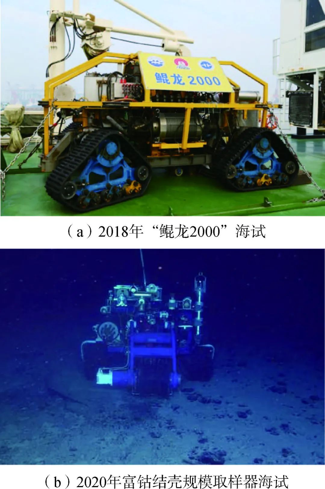 2005年,中国开始对富钴结壳采集装置开始样机试验和数值仿真研究。2016年,长沙矿山研究院研制的富钴结壳采矿头在西太平洋合同区成功开展了现场采掘试验,验证了螺旋滚筒采矿头的可行性;2018年,长沙矿山研究院研制的富钴结壳规模取样器“鲲龙2000”开展2000米级海试(图5),并于2019年完成2900 m水深的声学测厚、行走、截割与采集等综合海试,并采集了150 kg富钴结壳。同期,中国科学院深海科学与工程研究所于2018年在南海海域2500 m水深开展富钴结壳规模采样车海试,获取富钴结壳矿石样品;2020年,由中国科学院深海科学与工程研究所和招商局工业集团有限公司共同研发的富钴结壳采矿车于1300 m水深的海山区完成了海底行走、切削破碎、样品采集等独立作业任务,并与“深海勇士”号载人潜水器联合作业,实现原位监测与环境采样(图5)。