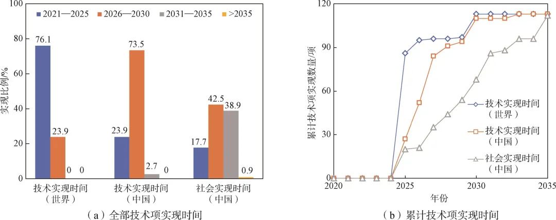 针对深海采矿共113项关键技术,中国工程院重大咨询项目“海洋装备发展战略研究”利用德尔菲专家问卷调查方法分析了国内外的主要技术实现和社会实现时间,如图6所示。结果表明,世界的主要技术实现时间在2021—2025年,预计2030年全部实现;相比而言,中国的主要技术实现时间集中在2026—2030年,预计2035年全部实现;对应地,中国的社会实现时间相应延迟,主要集中在2026—2035年,且仍有少量需2035年后才能实现。总体上来看,中国技术实现时间仍滞后世界,但在2030年之后能够基本实现各领域技术的同步。